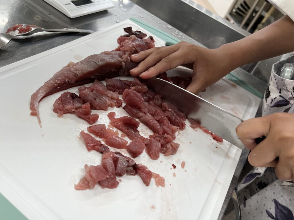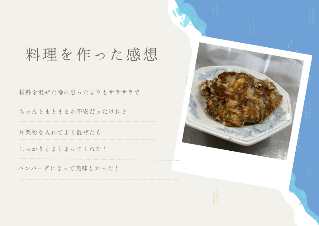 旬のお魚料理 6月! カツォゾネスのヘルシーハンバーグ~ レシピ 2025.10.072025.10.17 がっつりとしたハンバーグが食べたい!でもちょっとカロリーが気になっちゃうようそんなあなたに!がっつり食べられるうえにヘルシー! さらに栄養満点!6月の旬のお魚「カツオ」を使ったヘルシーレシピです! 材料! カツオ … 420g木綿豆腐 … 350g青じそ … 7gネギ … お好みの量 片栗粉 … 31.5g水 … 52.5mlしょうゆ … 大さじ2と3分の1みりん … 大さじ1と4分の1弱 作り方!! 手順1青じそは手でちぎり、カツオは包丁でたたく。 「なめろう」ってわかるかな?あんなイメージでカツオを叩くよ! 手順2豆腐をペーパータオルで包んで耐熱容器に入れ、ラップせずに電子レンジ(600w)で3分加熱し。粗熱をとる温め時間は二人分の目安だよ!豆腐の量に合わせて調整してね! 手順3ボウルに、カツオ・豆腐・青じそ・片栗粉・ネギ・しょうゆ・みりんを入れて、手でしっかりとコネ、丸く成型する 食べたい大きさで、ハンバーグの形にしてね! 手順4フライパンに油を熱し、ハンバーグのタネを並べて、焼き色がつくまで中火で焼く ハンバーグの大きさに合わせて焼く時間は調整してね! 手順5水を加えてから蓋をして、火が通るまで2分くらい蒸し焼きにしたら完成! ※大事なこと※食べる前にはみんなで「いただきます」と言おう!作ってくれた人 獲ってくれた人 運んでくれた人 売ってくれた人いろんな人やモノに感謝しながら「いただきます」をしようね!美味しさが2億倍になるよ!