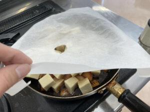 再び沸いたら高野豆腐を入れ、クッキングシートで落し蓋にする