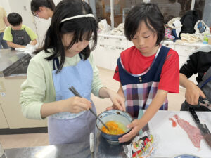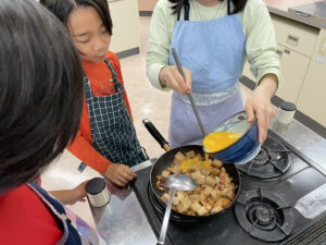 溶き卵を用意したら、フライパンに醬油を回しかけ溶き卵も回し入れる