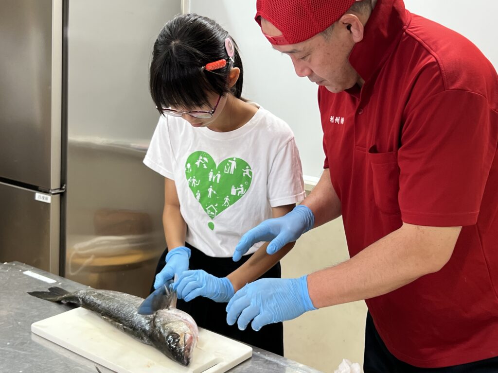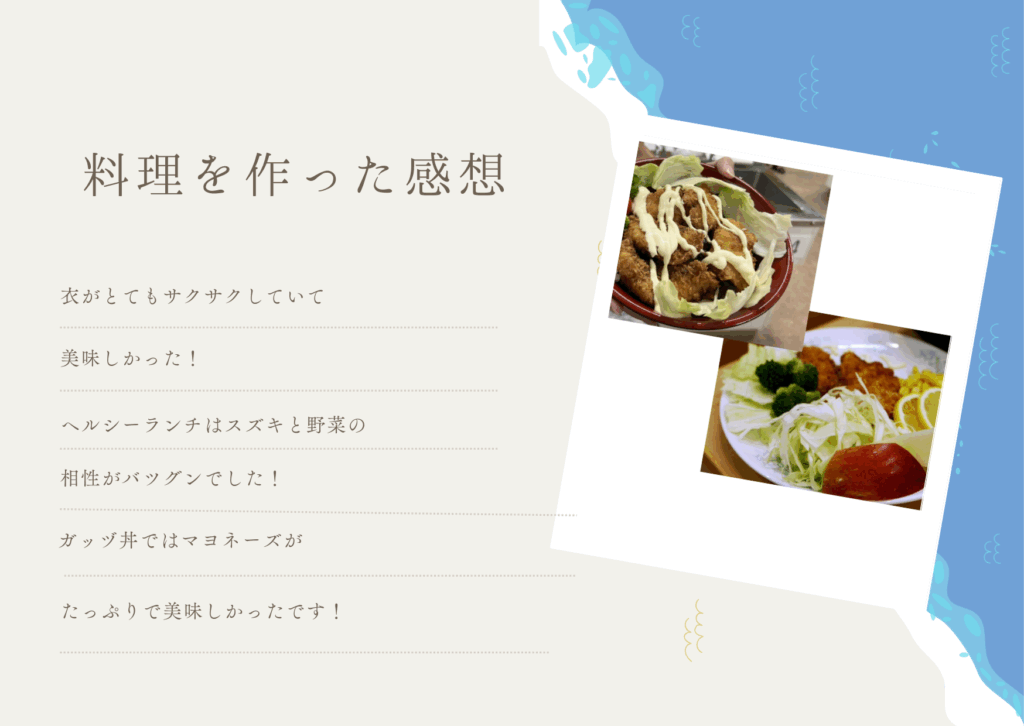 旬のお魚料理 8月! すずきももかのヘルシーランチ & すずきしょうへいのガッヅ丼 旬のお魚料理 2025.10.16 ヘルシーにキメたい!がっつり食らいたい!そんなあなたに!その姿を七変化!8月の旬のお魚「スズキ」を使った二種類のレシピです! 材料! スズキ … 一尾卵 … 4~5個キャベツ、リンゴ、プチトマト、レモン、ブロッコリー、コーン … 各適量肉(牛) … 丼が埋まるくらい パン粉 … 適量小麦粉 … 適量塩コショウ … 適量 作り方!! 手順2までは同じだよ! 手順1スズキをひたすら捌く! ヘルシーなら一口サイズ?ガッヅなら口いっぱいにほおばるくらいの大きさがいいかもねっ!目指せハムスター! 手順2小麦粉 → 卵 → パン粉の順に付けてキツネ色になるまで揚げる! スズキの揚がる音に耳を澄ませて……さながら、料理を応援する拍手みたいなんだよ…… まずは「すずきももかのヘルシー丼」の作り方! 手順1お皿に、スズキのフライ、キャベツ、リンゴ、プチトマト、レモン、ブロッコリー、コーンを盛り付ける いろんな食材があるよ!盛り付けの腕が試されるね! 手順2マヨネーズで「ヘルシー」と書いたら完成! マヨネーズで文字を書くのは結構難しいよ!オムライスのケチャップを思い出して!美味しくな~れっ! 次は「すずきしょうへいのガッヅ丼」の作り方! 手順1丼にご飯を盛り、焼いたお肉をご飯の上にひき、その上にフライを盛り付ける ガッヅ丼だからね!ご飯の量もがっつり盛ろう! 手順2マヨネーズをかけ、キャベツ、ブロッコリー、トマトを添えたら完成! ガッヅがつきそう!そう思えたら完璧な出来栄えだよ! 完成!二種類完成だよ!スズキの変化を楽しんでね! ※大事なこと※食べる前にはみんなで「いただきます」と言おう!作ってくれた人 獲ってくれた人 運んでくれた人 売ってくれた人いろんな人やモノに感謝しながら「いただきます」をしようね!美味しさが2億倍になるよ!